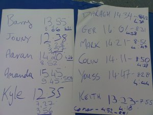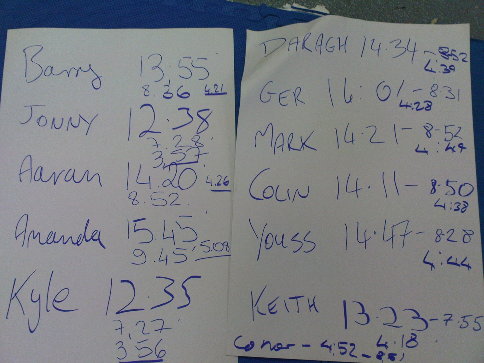 As you can see the times were fairly good. The deal was that you had to do a burpee for every second you were above 14 minutes for 3k, 10 minutes for 2k and 5 minutes for 1k. There were very few burpees done and I really underestimated the times on the 2k which everyone ripped through without any burpee danger. In my defence though I think the run was actually slightly shy of 2k though. The leaders of the pack were Jonnny, Kyle and Keith. I was in the second group with Jonny and Kyle and they were being super competitive with each other and burned me on the last stretch each time. Keith arrived back on the first one and I was beginning to think he’d taken a short cut, but apparently he hadn’t.