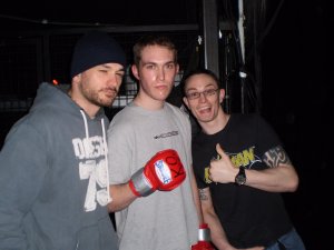 This is a great photo. Keith is all vassed up and ready to rock, looking deadly serious, I’m squinting because of the flash, and Ivers looks like some tourist who has just run in from the side to get in our photo. This one will not be appearing in the newspapers. Check out the KO that I wrote on Keith’s gloves earlier. I must be psychic.