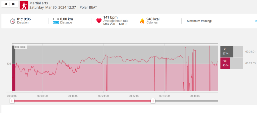 Now, Saturday was interesting. I dug out the Heart Rate Monitor. My mate Fergal gave me some advice a few years back about training with lower ranked guys, and one of his tidbits was to wear a HRM and see how hard you went. The idea being you might cruise if you’re not kept honest. Now I had a couple of really good rolls with Eoin my body-double brown belt so not all was low tech, but broadly I was training with people with whom I could coast if I wanted.