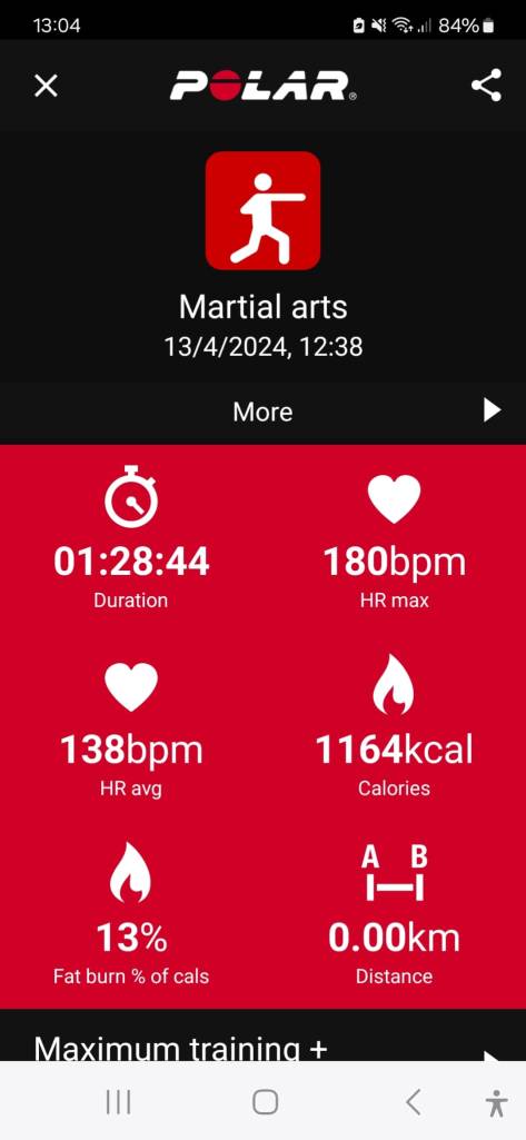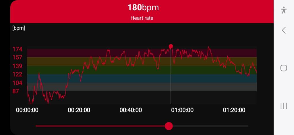 Hard to notice from this chart, but there are less valleys in this session than in last week’s. This probably means I wasn’t recovering from maximum efforts in the round, and between rounds. I felt that at the later rounds on Saturday. It felt like the rest periods were very short, and I wasn’t fully turned around after the minute’s recovery.