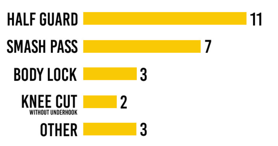 But look at the second and third on the list- attempted leglocks leading to sweeps, and attempted choke or armlock leading to sweep. And people call me boring when I say “Stay On Top”. There’s a time to risk a submission that might get you swept, and it’s when you’re either comfortably up on points, or down on points with limited time to go.
