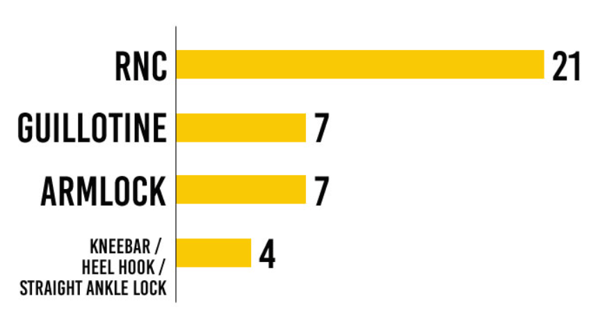 I remember doing a session once with John Kavanagh in my early days of Jiu Jitsu and he said “You should have good guillotine because you get your opponent’s neck in that position at least once every match”. Well, the stats don’t lie. The RNC might be the king of chokes based on positional dominance, but the Guillotine is the strike of opportunity.